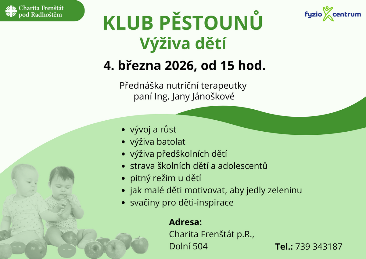 Pro Klub pěstounů pořádáme odbornou přednášku nutriční terapeutky Ing. Jany Jánoškové na téma Výživa dětí.